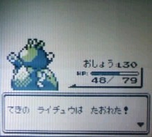 相性の所為でちょっと苦戦したものの、ギリギリレベル30だったのでわりかし楽でした。思ってたよりは。ただ、ライチュウの10万ボルトはやはり痛い。